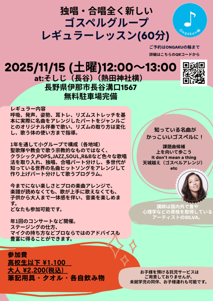 2025.11.06 11/15ゴスペルグループレギュラーレッスン&見学会の時間変更のお知らせ 当初13:30〜予定していました11/15ゴスペルグループレギュラーレッスン&見学会の時間を変更させていただきます。12:00〜13:00開催です。詳細は以下の通りです。